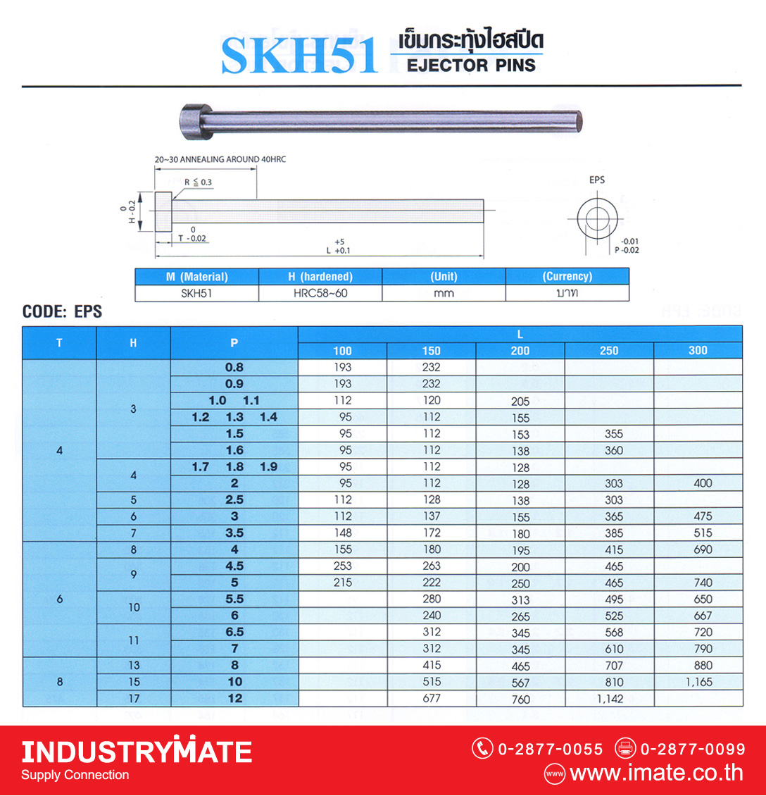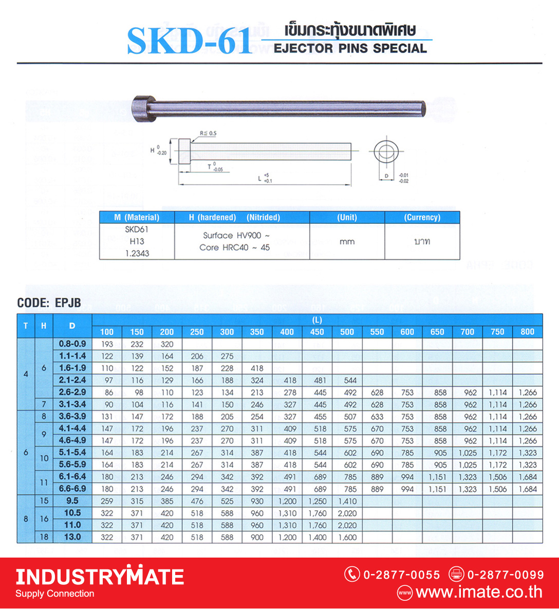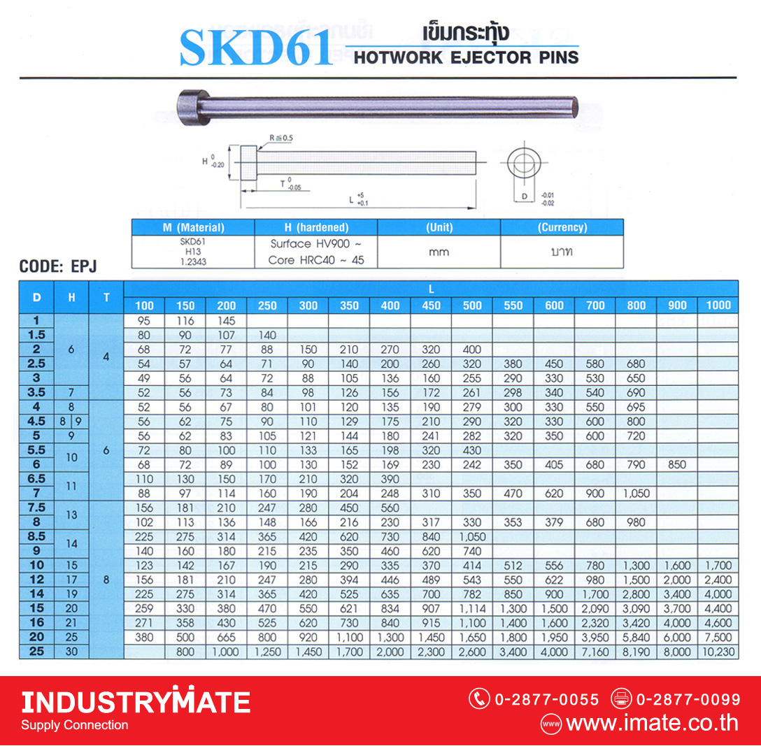 | เข็มกระทุ้ง (Hotwork Ejector Pins) เกรด SKD-61 ความแข็ง HRC 40-45 | |