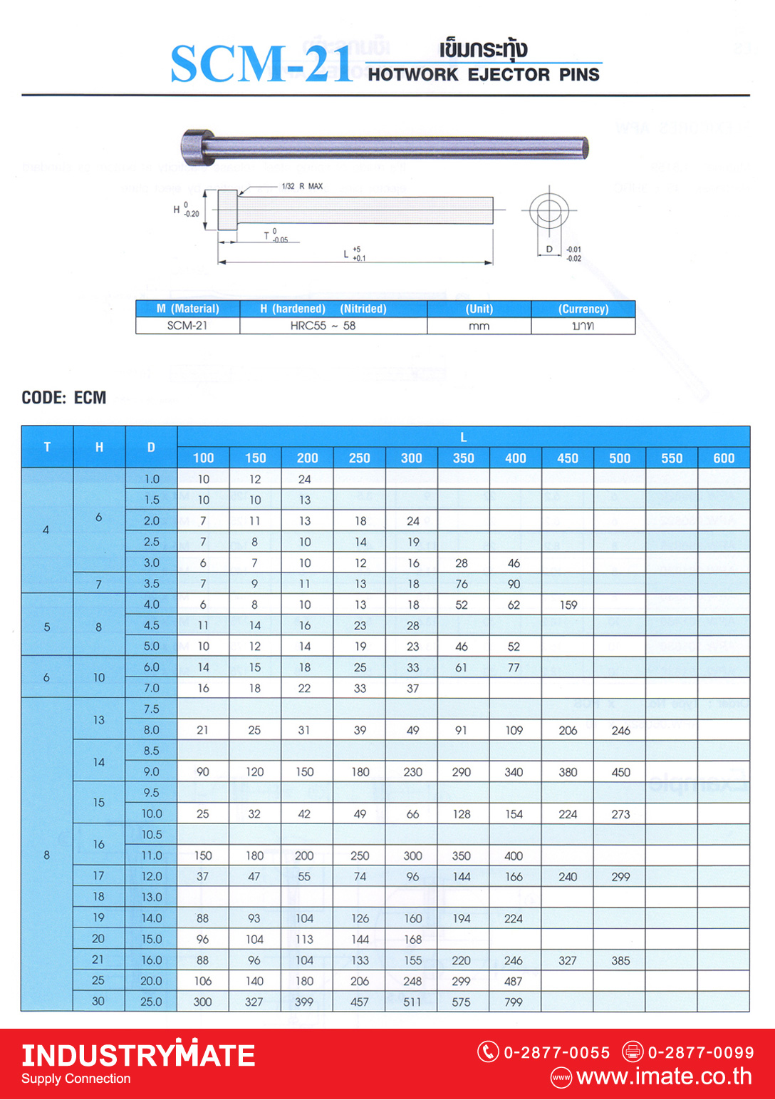 | เข็มกระทุ้ง (Hotwork Ejector Pins) เกรด SCM-21 ความแข็ง HRC 55-58 | |